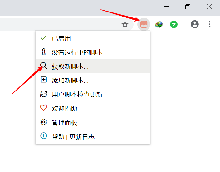 在浏览器右上角点击油猴图标,然后点击"获取新脚本..."就可以了(有五种下载脚本的方式)