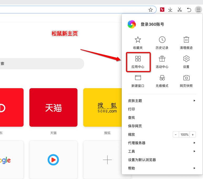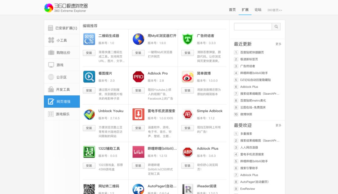 360浏览器是自带插件市场的。(当然,很多都是谷歌移植过来的)找到它很容易,点击菜单按钮就能看到了。