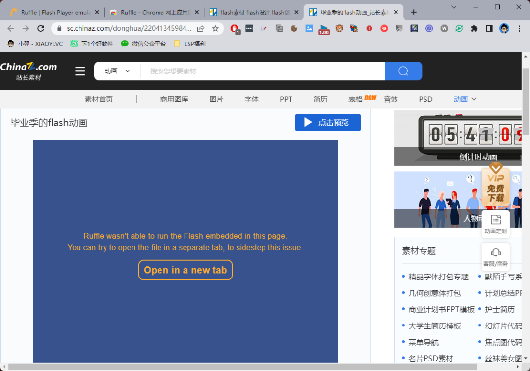效果测试:其实现在要找个 Flash 网站还是有点难哈哈哈,这里找到了一个提供 Flash 动画素材下载的网站,然后「Ruffle」会提示你使用新标签打开来播放 Flash。