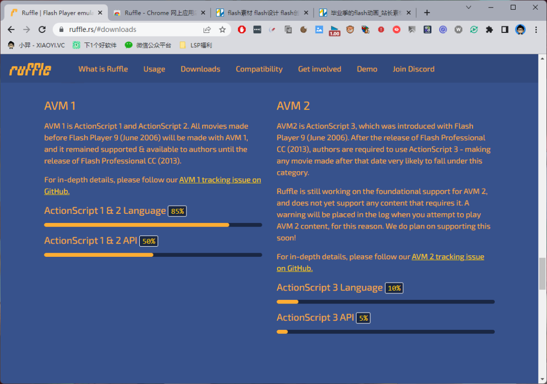 兼容性方面:作者表示主要分为AVM 1(ActionScript 1和2)和AVM 2(ActionScript 3)。ActionScript 1 & 2 Language 的进度已经达到 85%,而ActionScript 3 的进度在 10%,因为是开源项目,作者也希望有人能帮忙完善这个项目。
