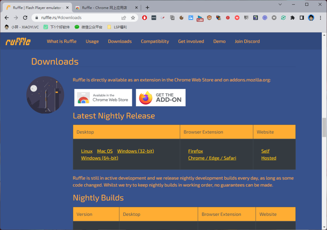 桌面版本:作者还给「Ruffle」制作了 PC 端版本,如果你电脑上没有 SWF 播放器的画,就可以使用它。下载后是 ruffle.exe 文件,需要通过命令的方式来打开 SWF 文件。