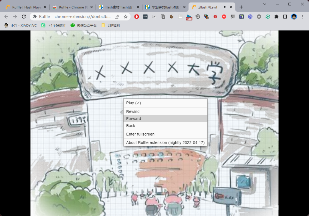 一些 Flash 文件播放是没有问题的,也有提供了右键菜单,提供了后退、前进、播放、全屏的功能。不过因为「Ruffle」目前还没完全兼容 Flash Play,所以一些复杂的动画,如游戏采用了 ActionScript 3 的 API,可能就无法正常播放了。