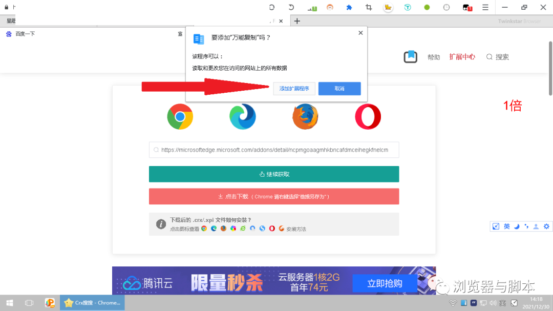 下载完成后自动弹出如下图所示。点击 安装扩展程序。
