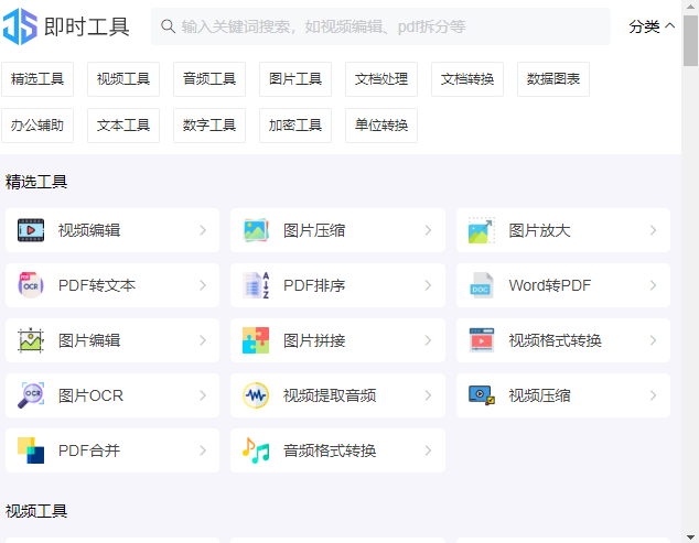 其中包含视频工具、音频工具、图片工具、文档处理、文档转换、数据图表、公共辅助、文本工具、数字工具、加密工具、单位转换等11类实用工具!