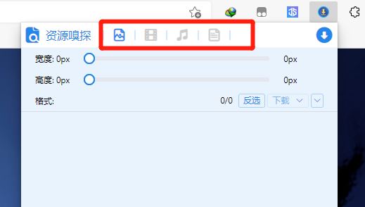 打开需要嗅探的网页,再点击右上角的插件,即可自动嗅探页面中包含的资源。