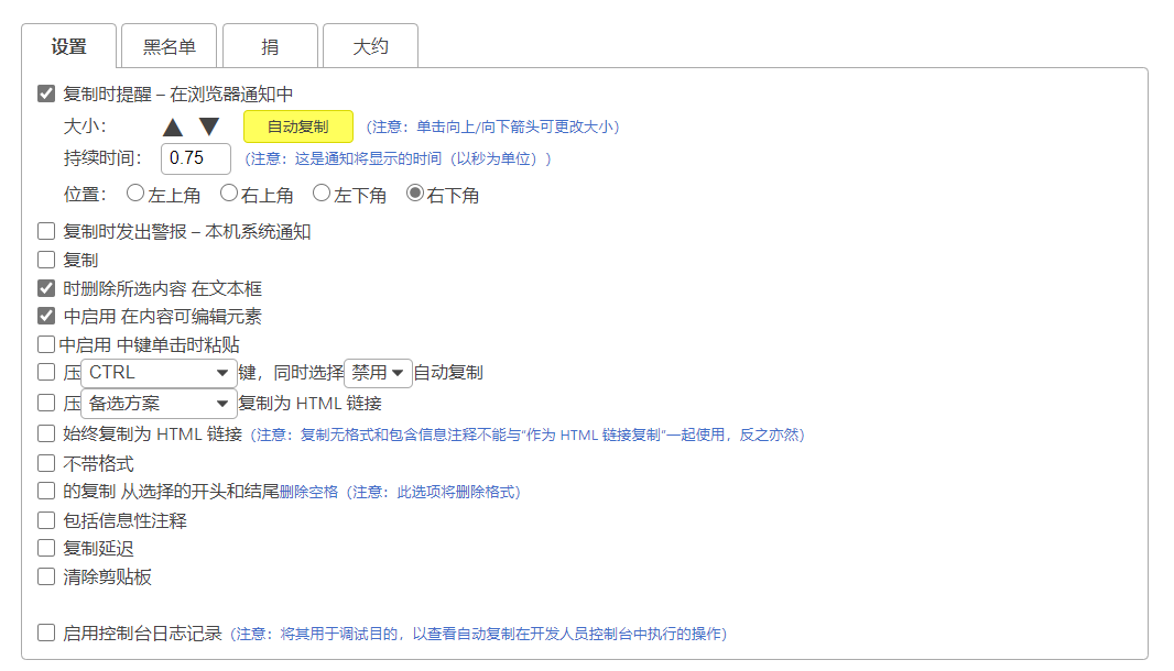 此外,它还支持自动复制延时、文本框启用/禁用、鼠标中键复制、复制为链接、不保留格式复制、设置黑白名单等功能,可以根据实际情况在设置中自行调整。