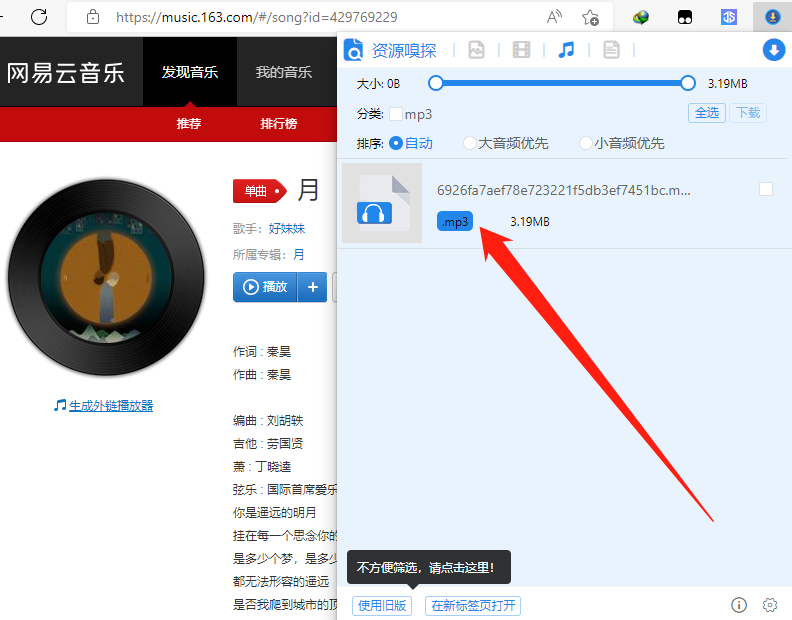 例如音频嗅探,打开一个包含音频的网页,开启插件,瞬间就可以嗅探出网页中的资源,只需选中资源,点击插件右上方的下载即可把资源下载到本地。