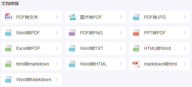 比如「文档转换工具」可以实现PDF与Word、Excel、ppt、txt、图片等常见文件格式之间的在线转换。