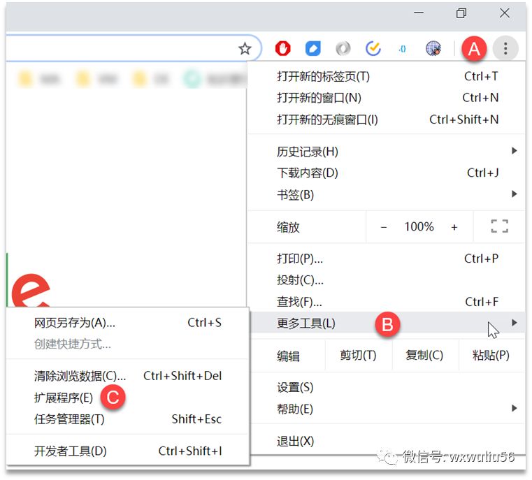 打开Chrome浏览器,如下图所示,跟着A-B-C三步走
