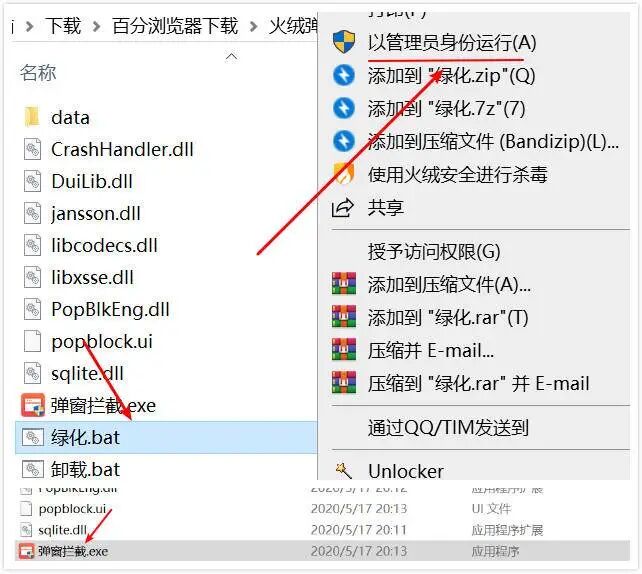如果你并没有在电脑管家找到这个功能,那么可以用「火绒弹窗拦截独立版」,下载文件解压后选择「绿化.bat」文件,右键单击「以管理员身份运行」;或者双击「弹窗拦截.exe」即可运行。