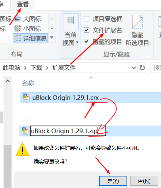 ●将crx文件修改后缀名为zip,也就是压缩包格式,回车确定修改,然后按照上述的压缩包格式扩展安装方法安装——本质上crx文件也是压缩文件。