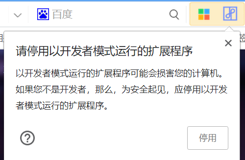 可能你终于成功从上述第三方Chrome扩展商店安装好了扩展,但是还没使用就出现了弹窗:请停用以开发者模式运行的扩展程序。