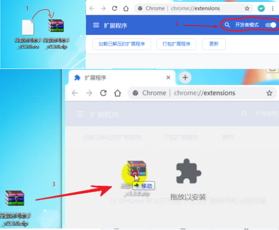 ●将 crx 的文件扩展名更改为 zip,在扩展管理页面打开开发者模式,然后拖拽安装——更改文件格式后也是压缩包格式的另一种安装程序,比之上一种方式少了解压且是直接拖进安装的。