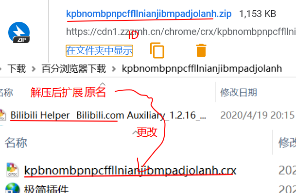 ●将扩展重命名为扩展的ID(由字母组成的32位值,很多网站下载的扩展压缩包都是以其ID命名,安装后可打开开发者模式查看),然后再按照crx格式安装,如果下载网站不提供那就没办法了。比如哔哩哔哩助手: