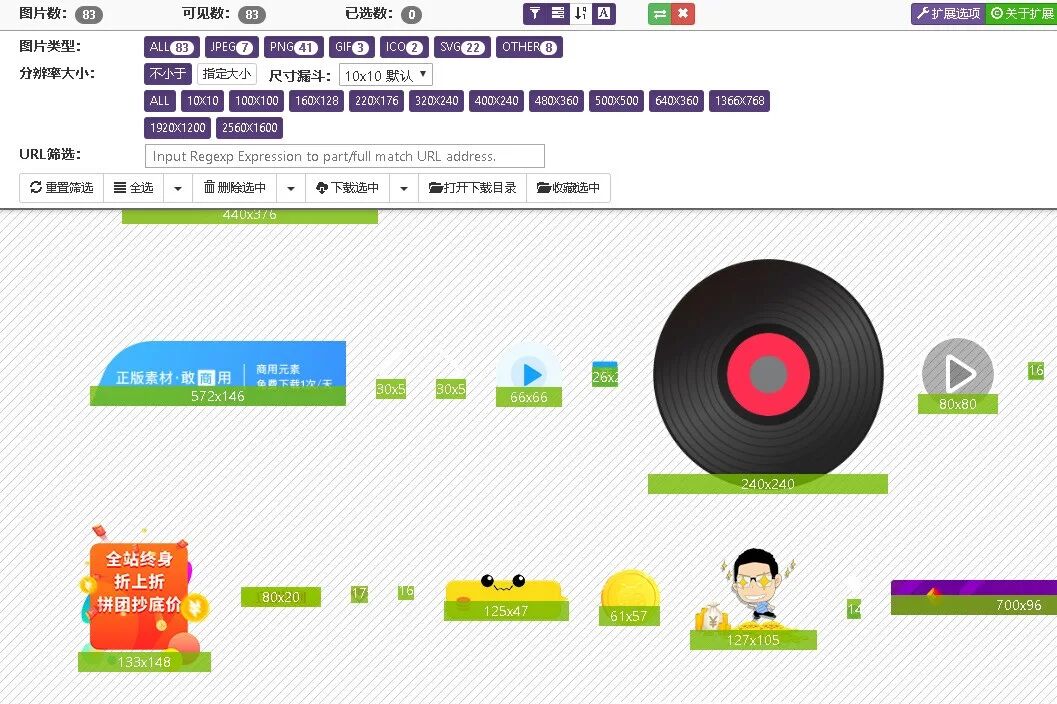 图片助手可以把所有的图片,隐藏的、原始的、没有显示的全部挖出来,甚至一个小小的1x1像素图标都不会放过。