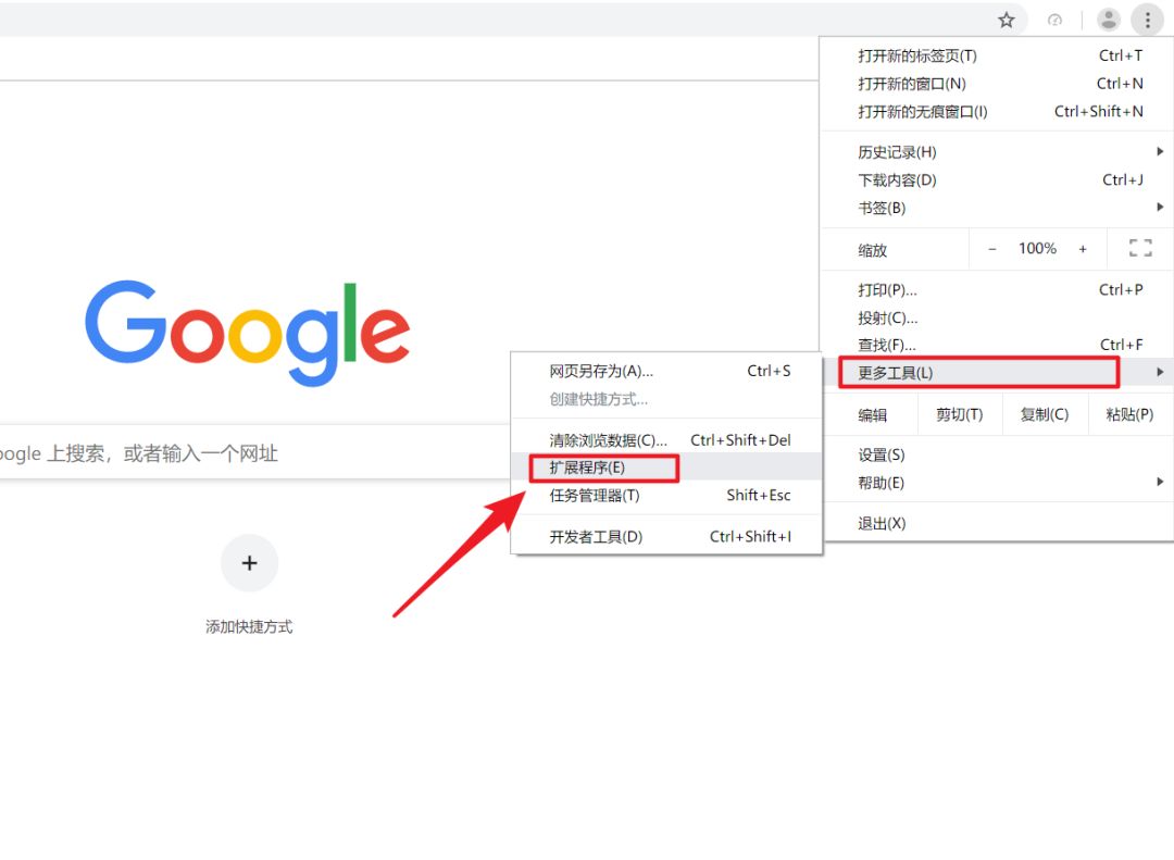 从设置->更多工具->扩展程序,或者地址栏输入chrome://extensions/按下回车打开扩展程序页面。