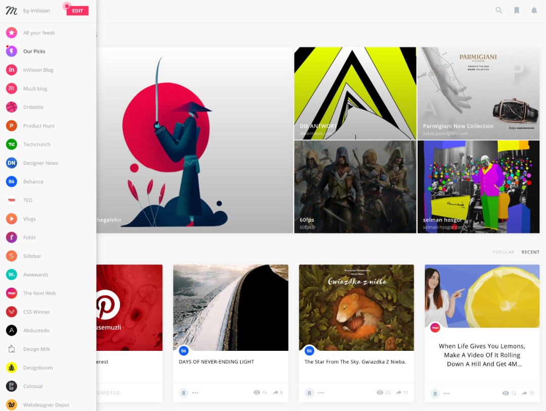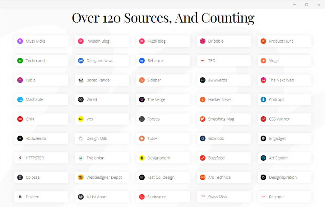 这个插件真的非常给力!它聚合了设计师常用的 120 多个网站资源,包括 Dribbble、Behance、hunts、Ted、InVision……收集了这些网站最前沿的设计、新闻、插画、作品和文章。