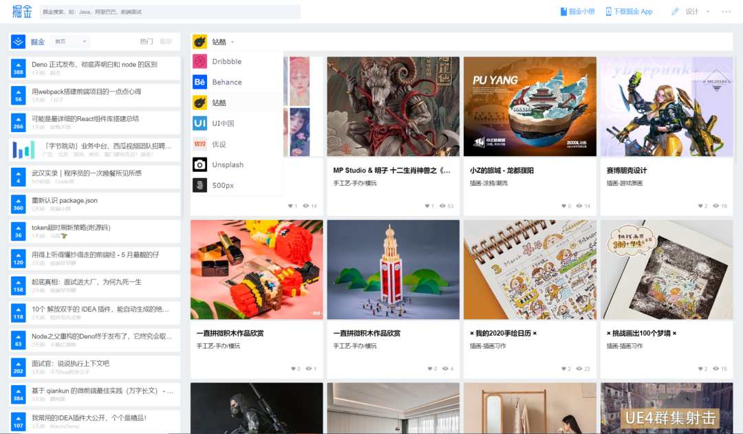 页面的左侧是偏 IT 类的文章,我们重点关注右边,通过下拉列表的选择,可以切换 Dribble、Behance、站酷、UI 中国等各大设计网站,查看当日最热门的设计图和优质文章: