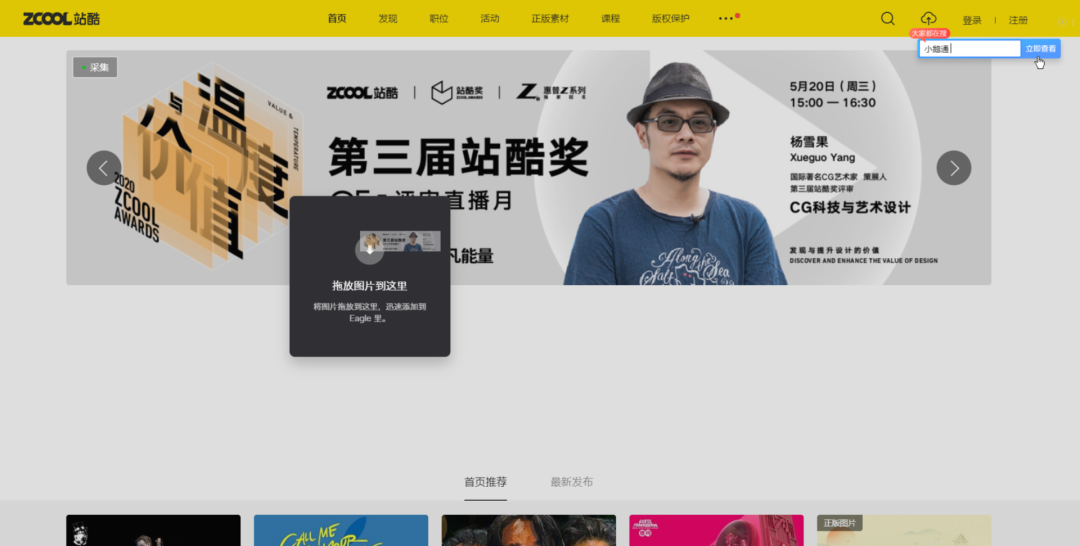 ① 想要收集网站上的灵感图片,可以通过 Eagle 插件直接把图片放下拖拉,就会出现拖放到 Eagle 的提示,可以快速把素材收集到本地。