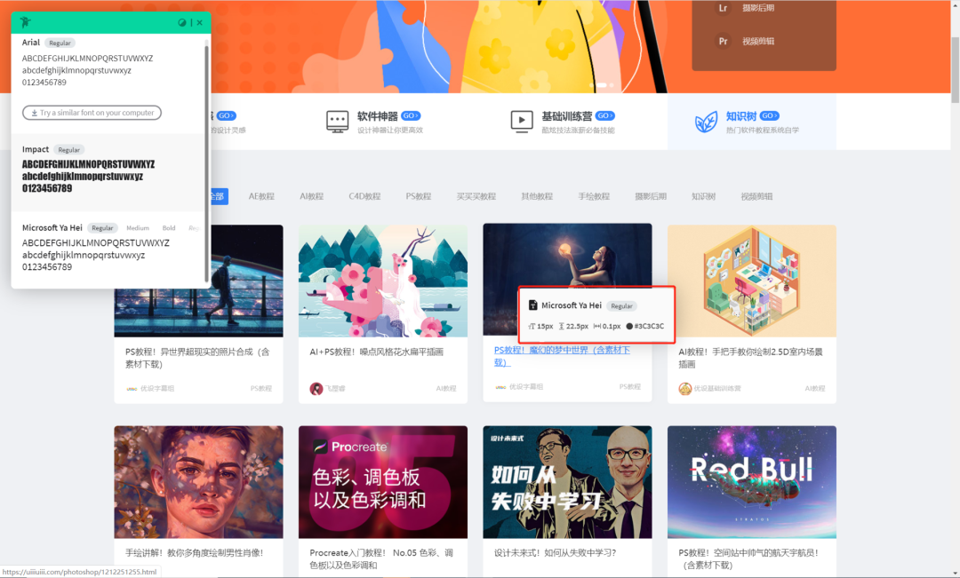 这款插件可以快速识别网站所用的字体,只要点击图标,然后把鼠标悬浮在需要识别的文字上方,就可以显示出该处字体的详细信息,包括字体名、字号、字体颜色、字体来源等等: