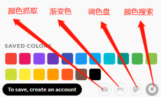 这一款配色插件的功能更加丰富!在浏览器中点击插件图标,可以看到有现成已经保存的一系列颜色。右下角有一排按钮,分别是: