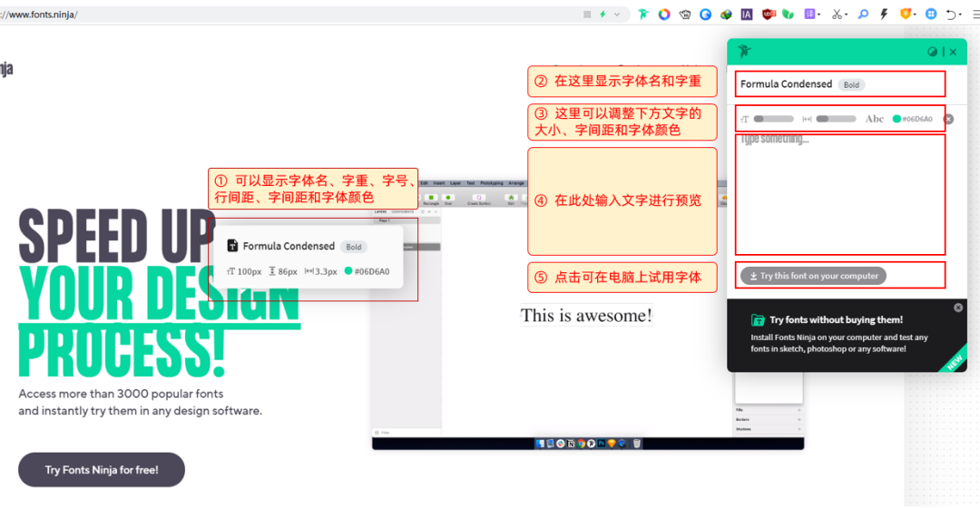 和 WhatFont 不同的是,这款插件可以一次识别出当前网页上所有字体的信息,还可以链接到字体网站显示具体的信息,包括是否免费商用、购买价格等,并且可以直接在电脑上进行试用!