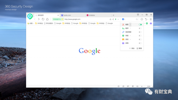 360安全浏览器还在平台右侧的插件栏和个人中心采用了全新的交互形式,让用户自定义自己需要的插件,让个人中心也更加人性化。同时,还将一些客户端做的功能用网页重新设计,比如扩展管理、登录管家管理、收藏夹整理,为用户带来更贴新也更贴心的体验。