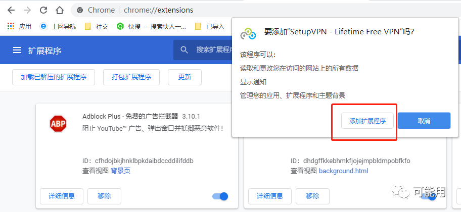 然后把下载好的crx文件拖拽到扩展程序页面,弹出下图提示窗,点击添加扩展程序,就已经安装好了