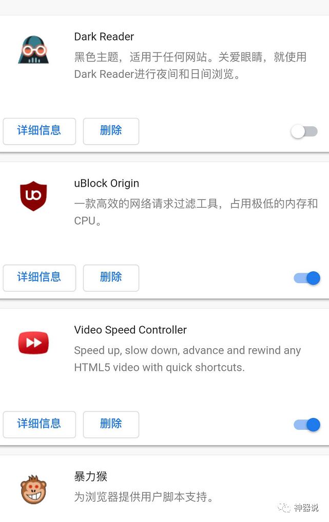 上图是神器说装了部分插件,曾经推荐过一款视频加速播放插件「Video Speed Controller」,可以自定义视频播放速度,没想到还可以在手机上面使用,再也不羡慕苹果手机有ALOOK浏览器了,现在我的手机也能浏览器倍速播放视频了。