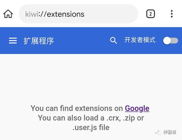 进入插件选项其实是进入了它内置的插件页面,电脑版Chrome进入方法是chrome://extensions/,是不是跟地址栏上的前缀很相似?提示我们可以通过google插件市场或加载本地的crx、zip等来实现插件的安装。