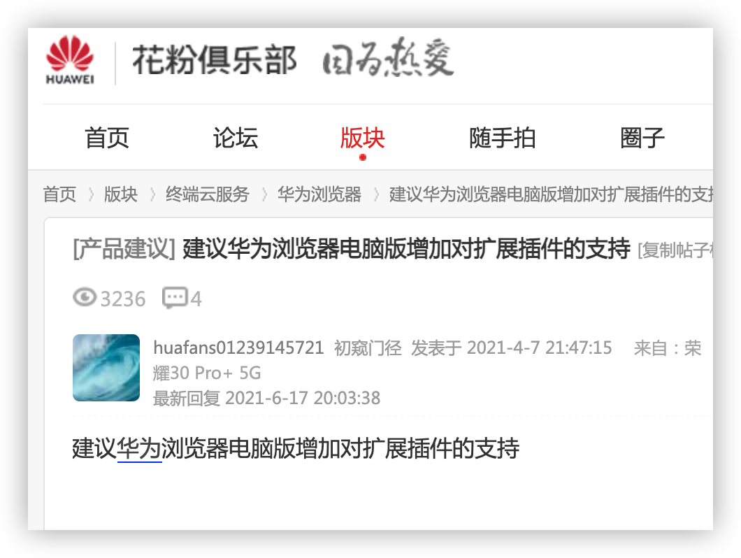直到最近,华为浏览器新版本更新,发布了11.0.5.300版本,终于带来了期待已久的插件安装功能。