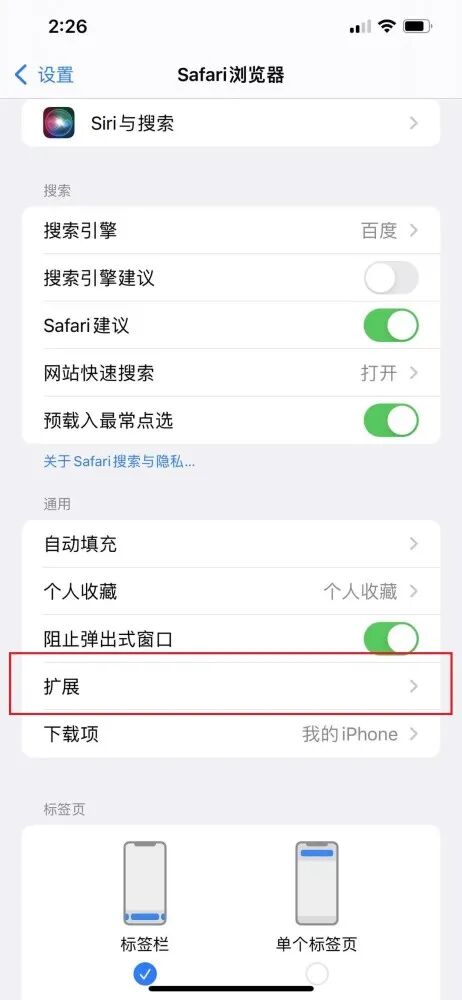 打开设置,进入【Safari浏览器】选项,在【通用】一栏下方,找到并进入【扩展】选项。