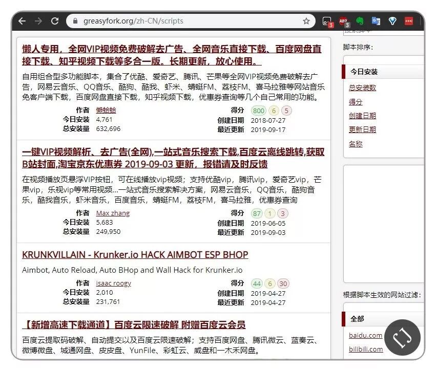 油猴插件强大之处在于它可以管理非常多的脚本,安装好油猴之后就要获取脚本才能使用。安装一些相关脚本之后,可以直接观看vip视频,去除下载限速,刷课等等。↓