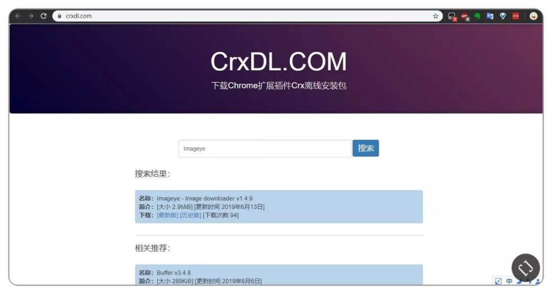 打开插件网址下载你需要的chrome插件,下载完成后,将刚刚下载的压缩包解压,解压后看见有两个文件,分别后缀为.crx和.pdf 的文件,.crx是插件安装包,.pdf是使用说明。我们以下载网页所有图片的「Imageye」插件为例。