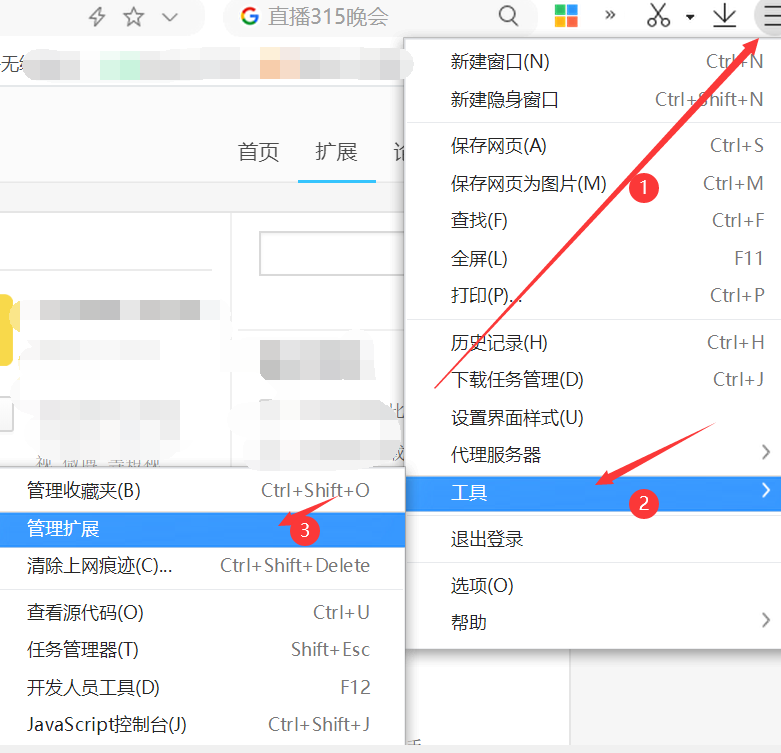 浏览器如何进入呢?打开浏览器,找到扩展(工具),点进去就可以看到很多的扩展的功能了(如果已经安装了插件)