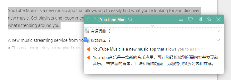 这是我用过最好用的划词翻译类工具。谷歌翻译对英文网页可以全页翻译,但是中文网页里的英文往往检测不出来,这个时候沙拉查词就太方便了,只要选中单词或段落马上就出翻译,从此墙内外畅行无阻。