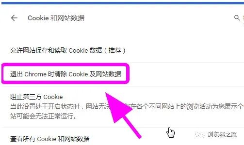 6、进入cookie和网站数据,找到【退出Chrome时清除cookie及网站数据】并将后边的开关打开,完成;