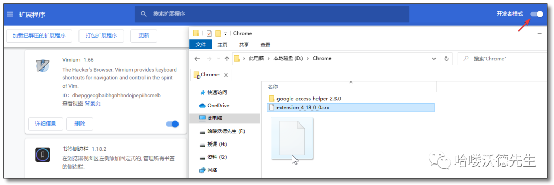 打开右上角开发者模式,将对应的crx文件拖入浏览器中即可。