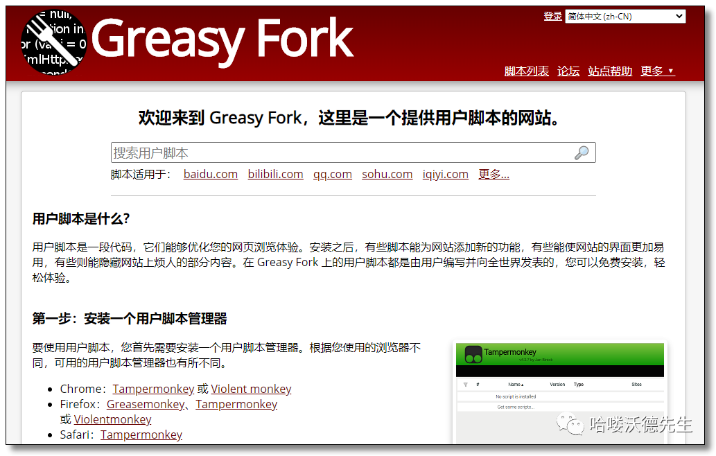 安装该插件以后,打开网站:https://greasyfork.org/zh-CN 搜索其他用户已经开发好的脚本,而我们刚才安装的插件,其实就是一个用户脚本管理器。