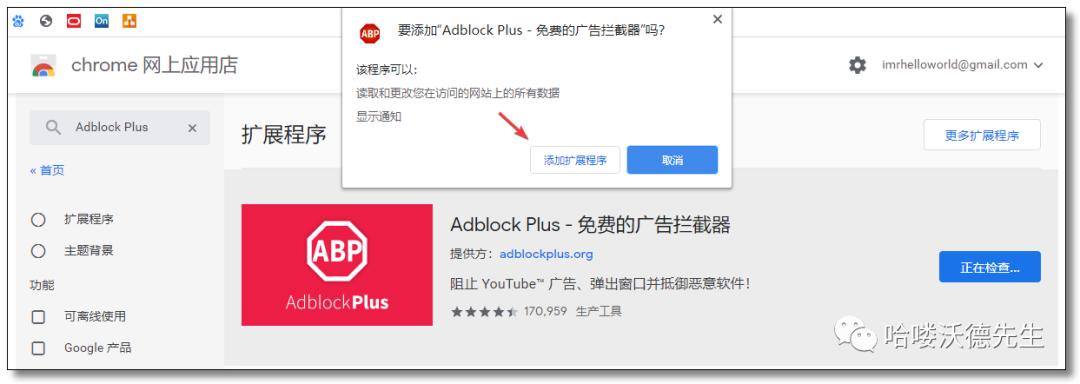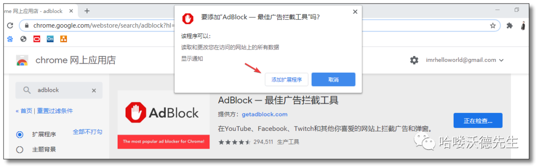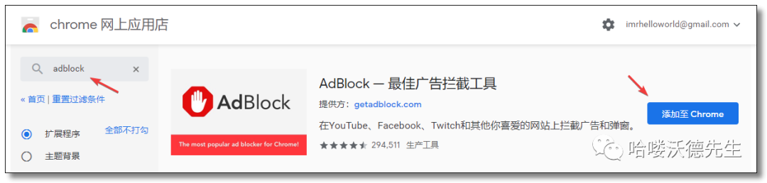 在线安装方式,通过谷歌网上应用店搜索AdBlock然后选择添加至Chrome→添加扩展程序即可。