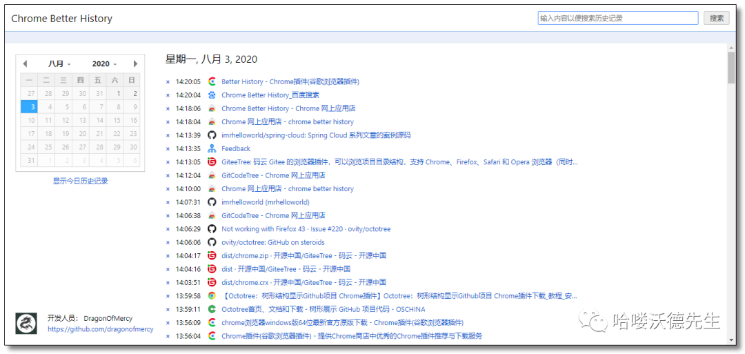 安装插件以后,可以在 Better History 中更加快速地查询历史记录列表,同时通过 Better History 提供的强大的搜索功能,用户还可以更加快速地从访问网站的历史中找到自己想要的内容,就算用户不小心关闭了网页,也能在若干的时间后,轻松地重新打开该网站。效果如下: