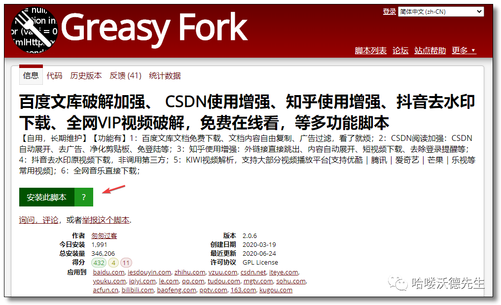 根据标题大概可以得知每个脚本的具体作用,选择自己喜欢的然后点击标题进入详情页,进行安装: