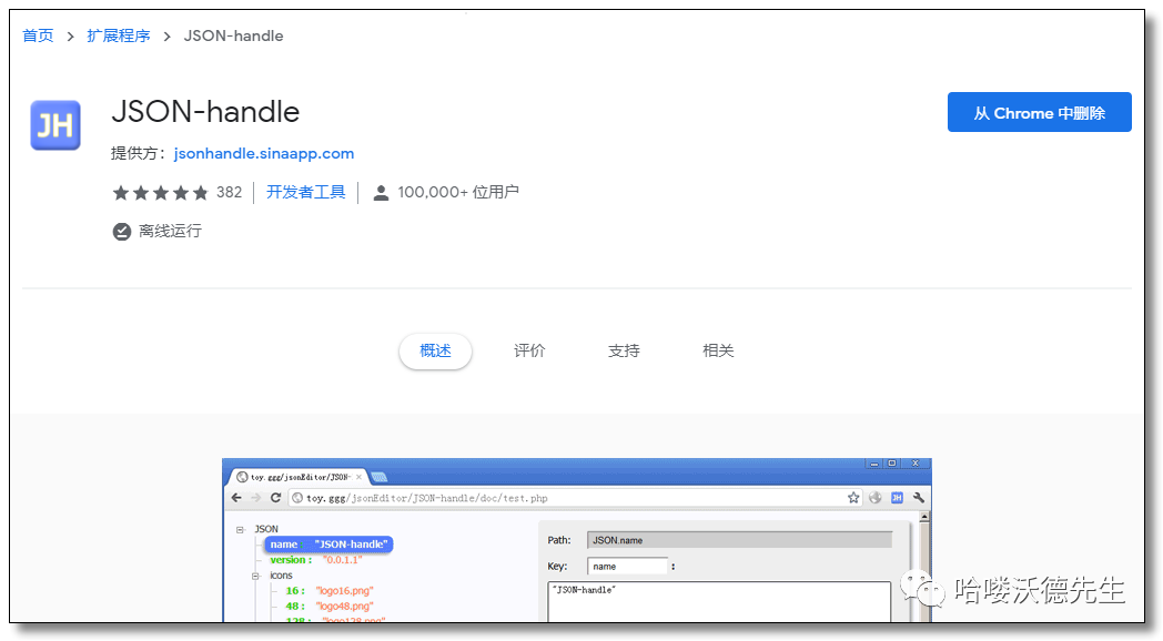 前端助手其实已经集成了 JSON 美化、JSON 比对的功能,但是作为一名开发人员我们可能需要浏览器将服务器返回的 JSON 数据直接渲染展示在浏览器中,而不是通过工具调出再复制粘贴过去,那么我推荐 JSON-handle,效果如下: