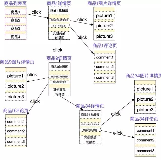 上图为具体的逻辑示意图。在列表页,点击其中一个商品,这里是商品1,进入详情页。详情页包括了该商品的轮播图、商品的图片详情入口、评论入口和推荐的其他商品入口。接下来进行如下操作:进入图片详情页,后退至详情页再进入评论页;后退至商品1详情页再由推荐商品入口进入商品9详情页,同样在商品9详情页进入图片详情页和评论页,再后退至商品9详情页;由推荐商品入口进入商品34详情页,再进行类似操作。最后保证在商品34图片详情页或评论页可以顺利后退至最初的商品列表页。