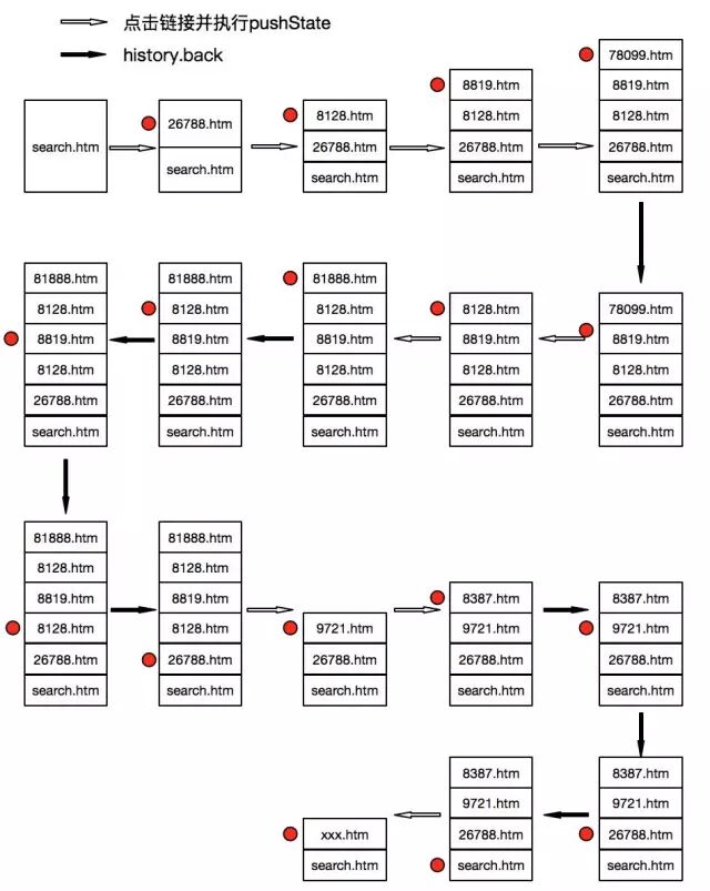 上图为测试实例。其中白色箭头意味着点击该链接并执行pushState操作(即操作1),黑色箭头则执行浏览器后退,红色的圆点为历史记录栈中的当前指针,而每个项则为历史记录栈,历史记录的个数则为其子项的数量。