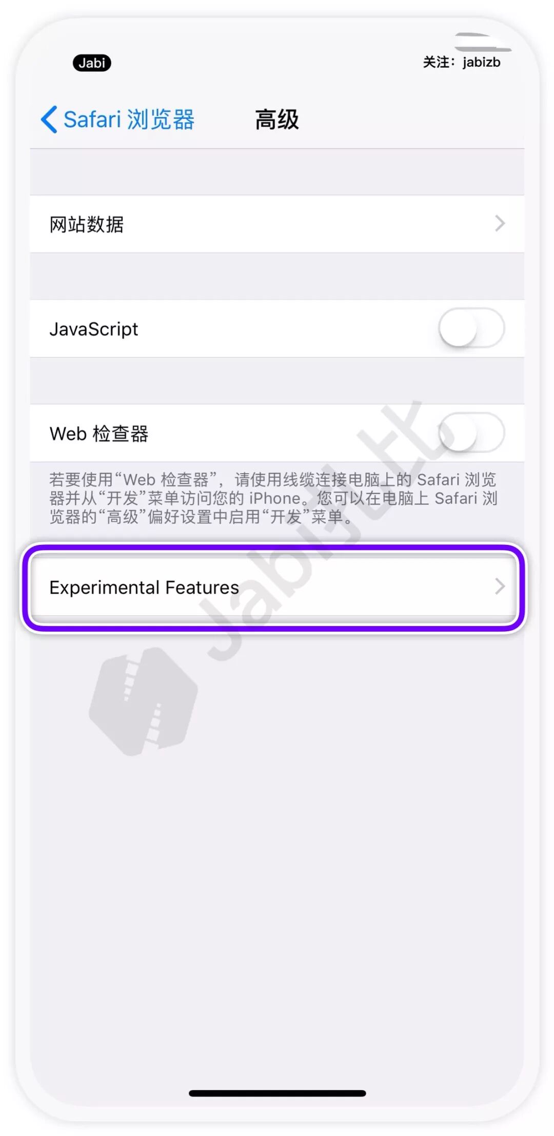 3、点击「高级」页面下方的「Experimental Features」选项来打开「试验性 WebKit 功能」。