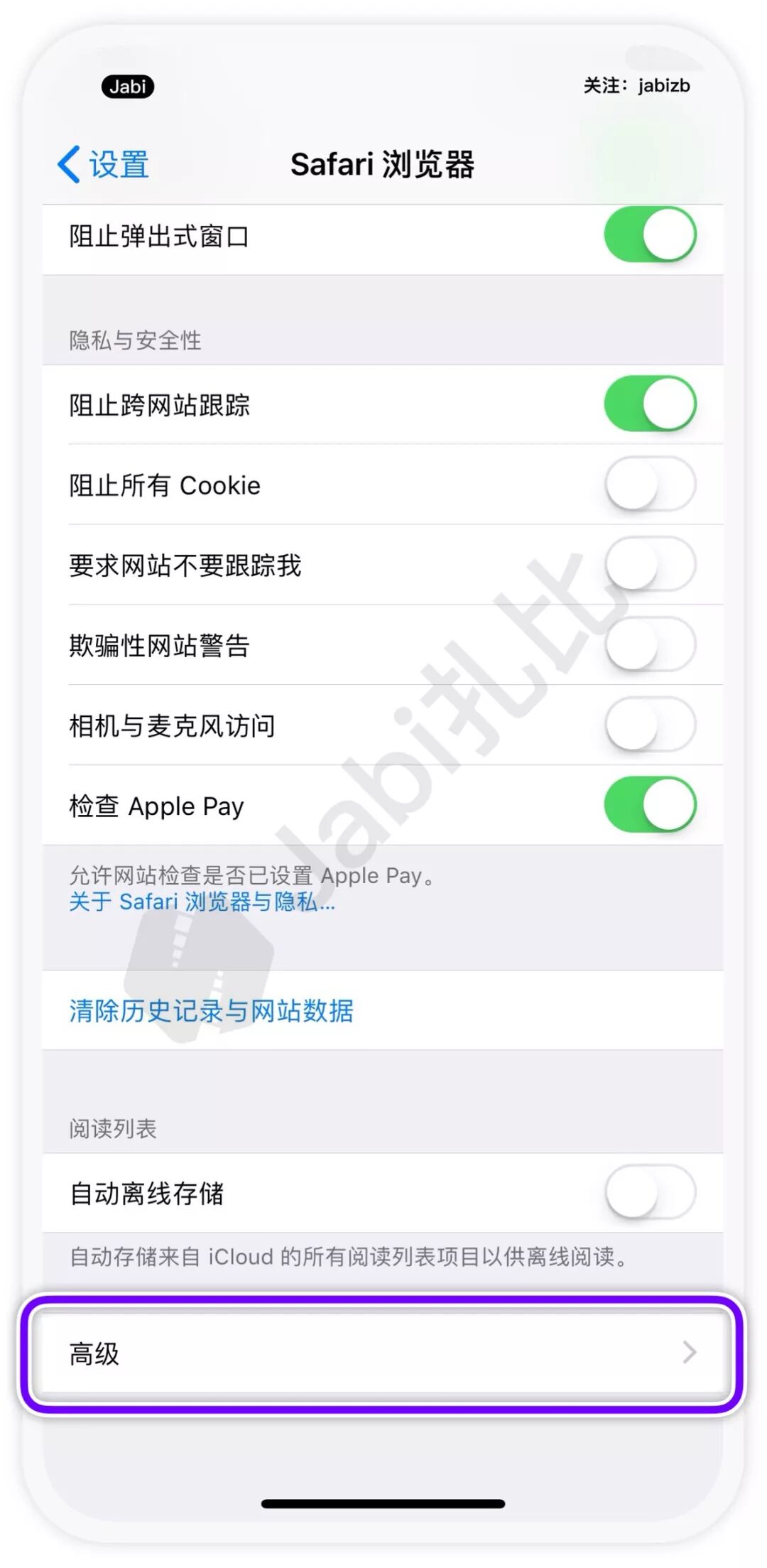 2、Safari 还有更高级的设置隐藏在设置中。打开「设置 - Safari 浏览器」,在底部点击「高级」。