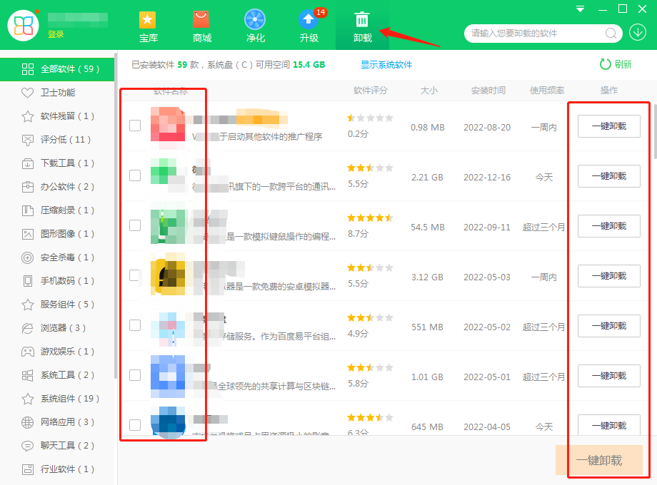 2、打开软件管家点击卸载按钮,列表中显示电脑中的第三方软件勾选相应的软件右边点击一键卸载即可。
