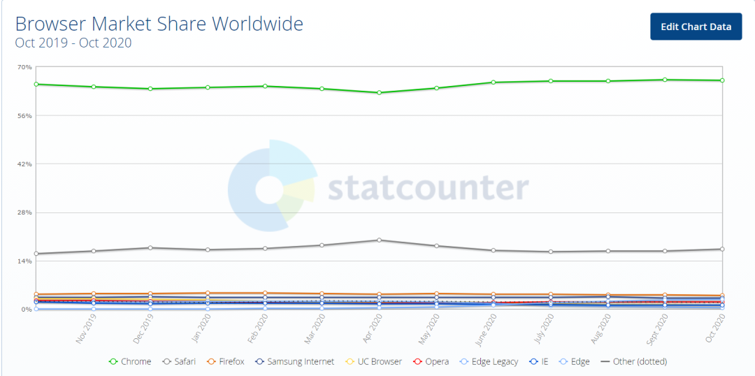 据 StatCounter Global 数据显示,在一段时间的用户数量的短暂上升后,截至今年 10 月,Edge 的市场占有率再次下滑,位居 Samsung Internet 之后,仅为 2.85%。由此可见,改用开源 Chromium 内核后,依然没能拯救 Edge。