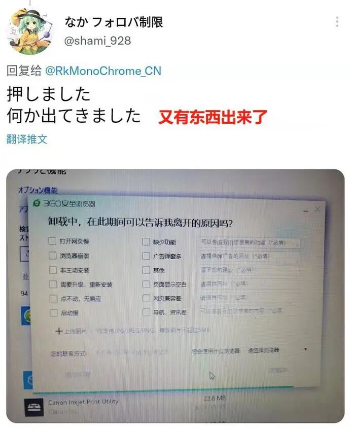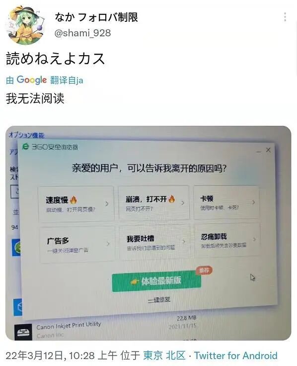 就在前段时间,推特上一位日本网友发的帖子,在国内火了。这事说来也挺搞笑,因为——他不会卸载360安全浏览器。